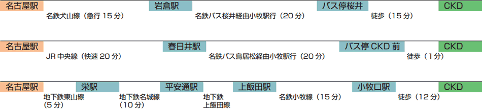 - 春日井駅下車、駅前から小牧行名鉄バスに乗り換え、『CKD前』バス停 下車