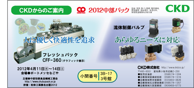 イベント Home 国内イベント 2012 中部パック 国内イベント 海外イベント 国内イベント 2012 中部パック は終了致しました。 ●会 期 : 2012年4月11日(水)~4月14日(土)●開催時間 : 10:00~17:00●会 場 : ポートメッセなごや 3号館 3B-17 主な出展品 包装機、空圧機器 会場、ブース案内