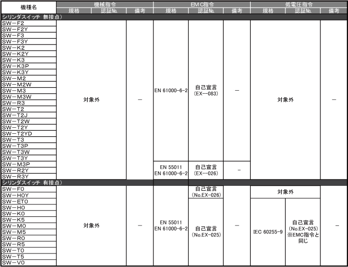 サポート・お問い合わせ Home サポート・お問い合わせ 各国規格対応品情報 CKD欧州規格適合品リスト(シリンダスイッチ) 各国規格適合品リスト シリンダスイッチ 認証品は仕様・詳細形番組み合わせによっては対応していない場合もありますので、 詳細および形番については弊社営業担当にお問合わせください。 シリンダスイッチ